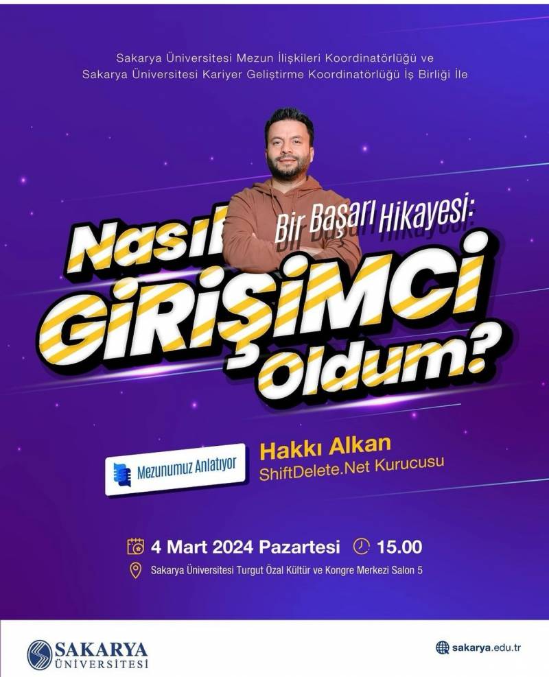 Türkiye'nin en önemli teknoloji platformlarından biri olan ShiftDelete.Net Kurucusu ve Sakarya Üniversitesi Endüstri Mühendisliği bölümü mezunu Hakkı Alkan teknoloji alanındaki deneyimlerini ve başarı hikayesini bizlerle paylaşacak. Etkinlik bilgileri ek'te mevcuttur. Tüm öğrencilerimizi bekleriz.