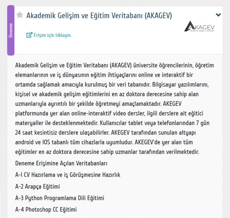 Akademik Gelişim Veritabanı’nda yer alan aşağıdaki 10 eğitim, 09 Kasım 2025 tarihine kadar deneme erişimine açılmıştır.
