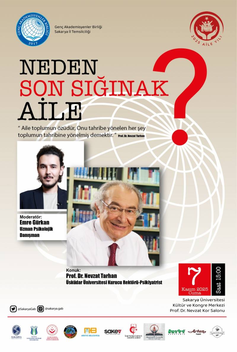 7 Kasım 2025 Cuma günü Sakarya Üniversitesi’nde, Prof. Dr. Nevzat Tarhan’ın konuk olacağı “Neden Son Sığınak: Aile?” başlıklı söyleşi düzenlenecek. Uzm. Psikolojik Danışman Emre Gürkan’ın moderatörlüğündeki etkinlik, saat 15.00’te Kültür ve Kongre Merkezi Prof. Dr. Nevzat Kor Salonu’nda gerçekleşecek. Aile kurumunun toplumsal önemi ve güncel tehditleri ele alınacak. Detaylı bilgi ekteki afişte yer almaktadır.