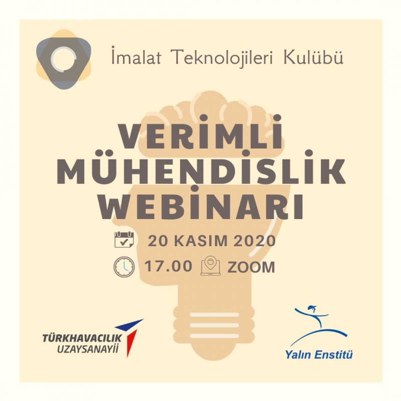 İstanbul Teknik Üniversitesi İmalat Teknolojileri Kulübü 20 Kasım 2020 Cuma günü saat 17.00 ile 19.00 arasında üretim, mühendislik, teknoloji, yalın felsefe gibi konularda önemli konuşmacıları ağırlayacakları Verimli Mühendislik Webinarını gerçekleştireceklerdir: Webinarın ana destekçileri Yalın Enstitü ve TUSAŞ olup etkinlik pandemi dolayısıyla online platformlarda yapılacaktır. Ayrıca meraklı olan tüm öğrencilere ücretsiz olarak açık olacaktır.